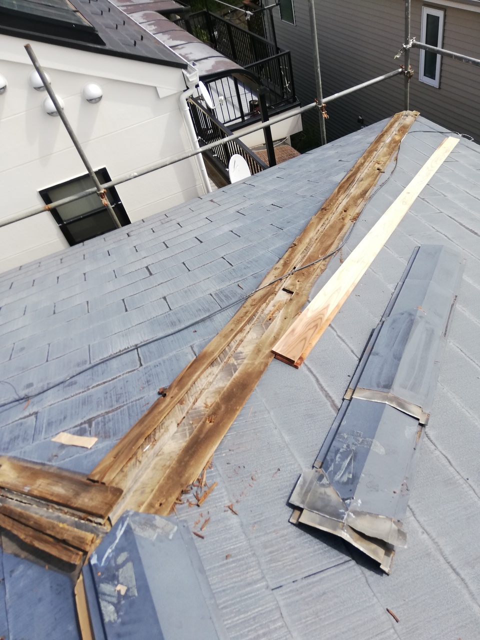 なぜ雨漏りしてしまうかというと簡単な構造で、棟板金を外すと屋根と屋根のつなぎ目になっているからです。