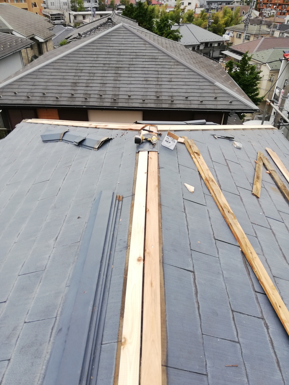 その他にもスレート自体が雨をしっかり弾いていない影響で屋根自体が雨水を吸い込み湿気てしまい、その結果、棟板金の下地の貫板も湿気て腐る→棟板金を止めている釘がしっかり効かずに板金が浮いてしまう→雨が降れば浮いた隙間からさらに吹き込んで貫板を痛めてしまう→という悪循環になってしまっていました。